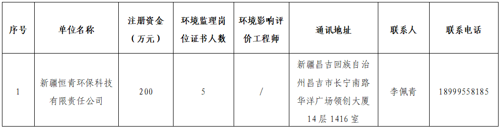 關于新疆恒青環(huán)??萍加邢挢熑喂经h(huán)境監(jiān)理機構名錄登記的公示